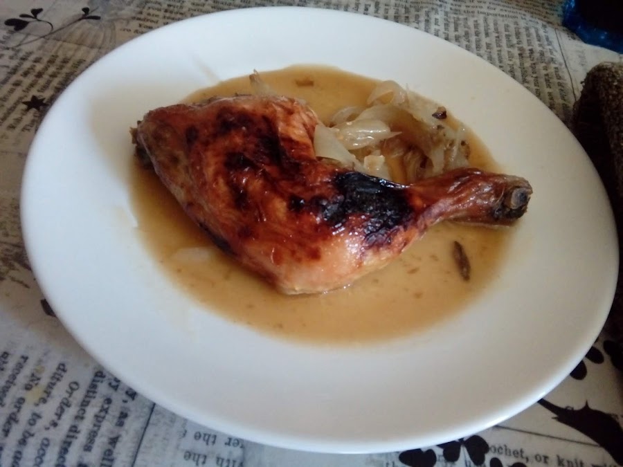 Salpimentamos los contramuslos limpios y los embadurnamos con la salsa agridulce. Los ponemos sobre la cebolla. Echamos un hilo de aceite sobre el pollo.