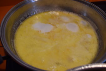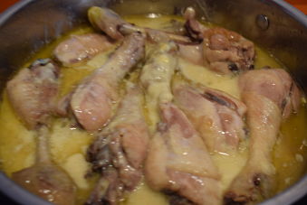 Remueve. Retira del fuego y añade la yema deshecha previamente en un poco de salsa. Vierte esta salsa sobre el pollo que teníamos reservado, deja que se cocine todo junto unos minutos más.