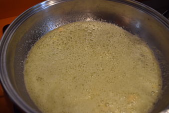 Mientras se hace el pollo, pon otra cacerola a calentar y derrite la mantequilla. Añade la harina, incorpora el caldo y la leche sin dejar de remover.