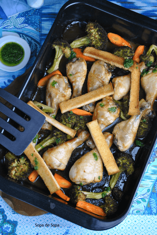 Si nos gusta la verdura más blanda ponerla en la bandeja desde el principio junto al pollo.