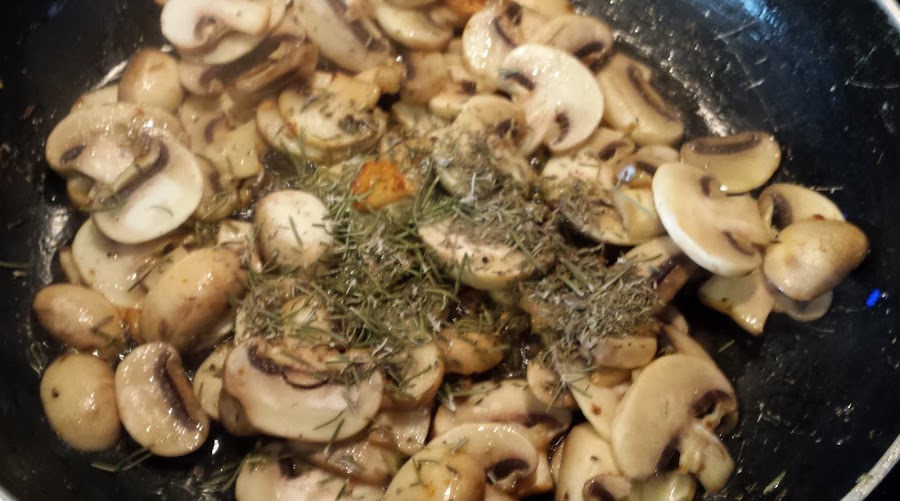 5. Limpiamos y laminamos los champiñones y los añadimos a la sartén junto con el resto del tomillo y el romero y la mitad del perejil picado. Subimos el fuego y dejamos que se cocinen hasta que se haya evaporado toda el agua que puedan soltar los champiñones.