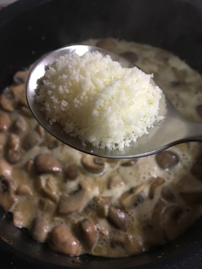 Se añade la leche evaporada a los champiñones, se espolvorea con una cucharada de queso en polvo, se remueve y se rectifica de sal.
