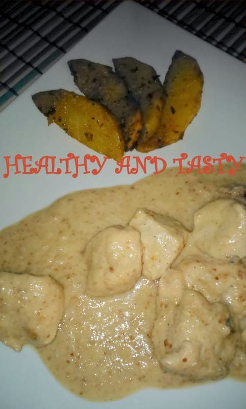 Cortamos a trozos las pechugas de pollo, las salpimentamos y las freimos en el mismo aceite. A continuación, añadimos el vaso de vino y lo ponemos a fuego fuerte para que se evapore el alcohol, y añadimos la mezcla de cebolla, ajo y almendra. Vertemos un vaso de agua y dejamos cocer a fuego lento hasta que la salsa reduzca un poco y el pollo esté tierno. ReCtificamos de sal y listo.