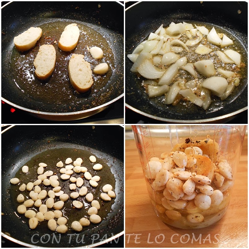 4. Doramos 4 rebanadas de pan por los dos lados junto con dos dientes de ajo. Lo añadimos al vaso de la batidora.