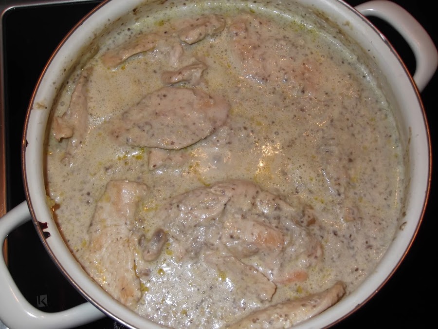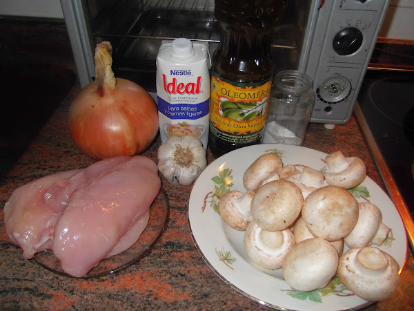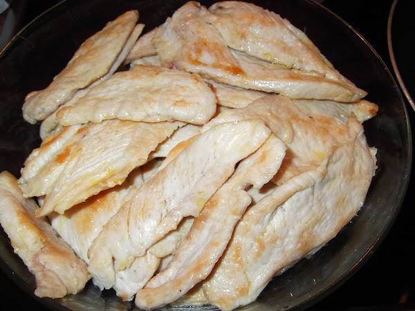 Ahora freís las pechugas de pollo, que habréis salado con anterioridad. En una cazuela echáis la cebolla, los