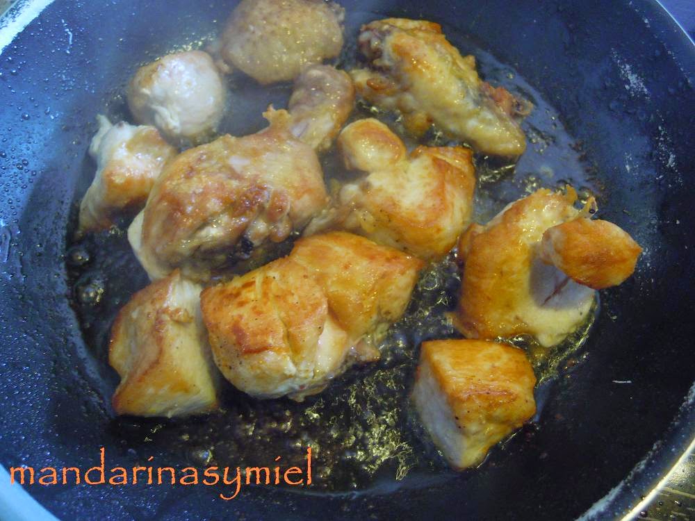 Cuando el aceite esté bien caliente, sofríe el pollo hasta que esté dorado, saca y reserva.
