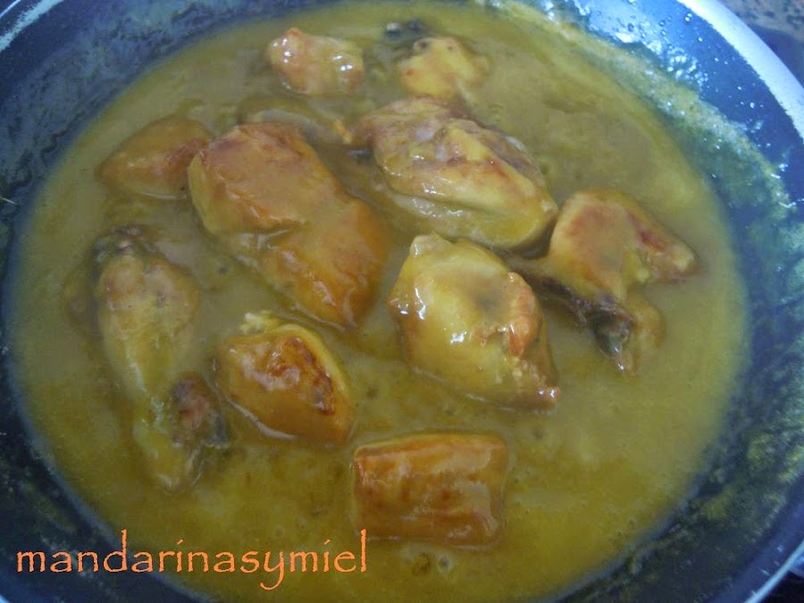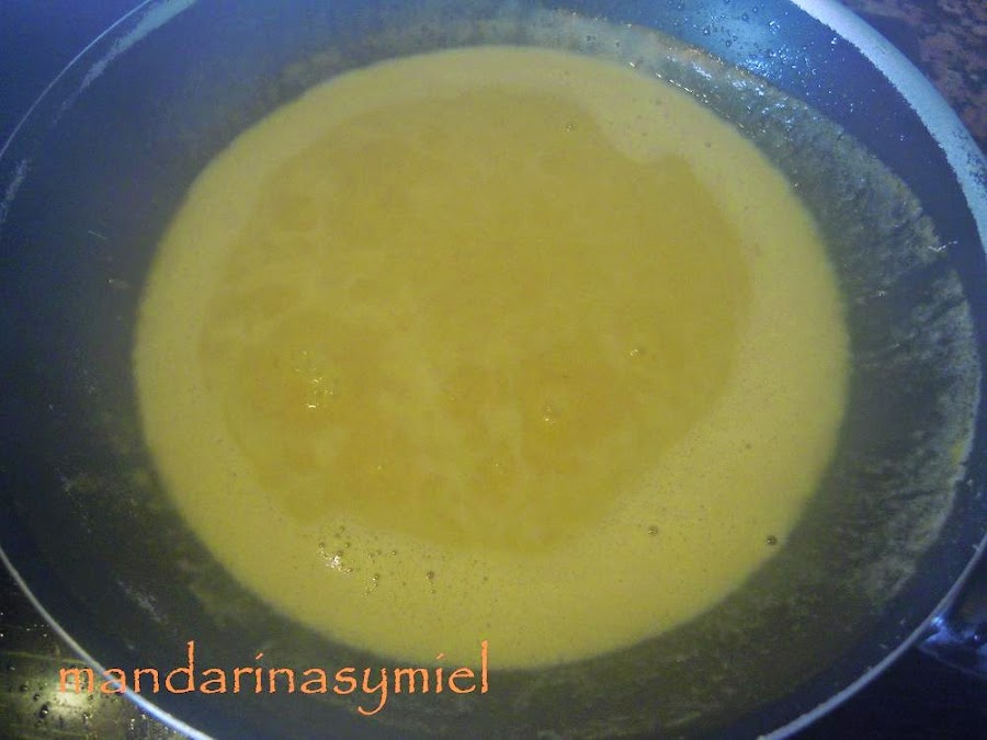 Cuando la cebolla haya cambiado de color, añade el chupito de licor de mandarina, remueve para que se evapore el alcohol, y añade el zumo de las mandarinas, reservando un poquito para disolver la maizena, pon también la pastilla de caldo, deja que se ponga a hervir.