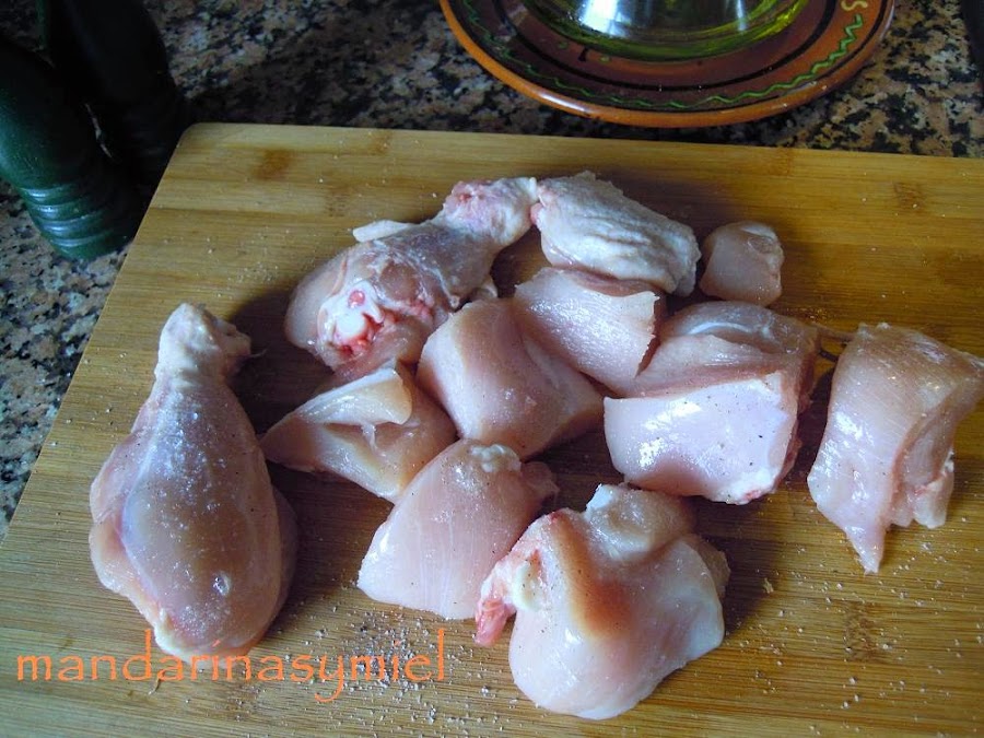 Salpimenta los trozos de pollo, a mi me gusta quitarle la piel, pero puedes dejarla si te gusta.