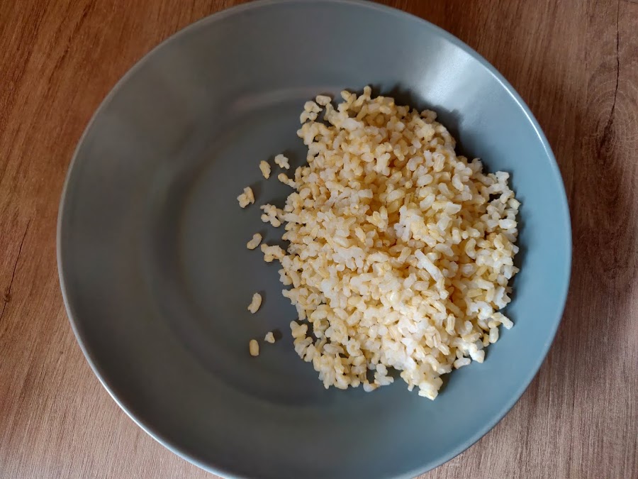 Emplatamos primero el acompañamiento que hayamos elegido, en mi caso arroz integral.