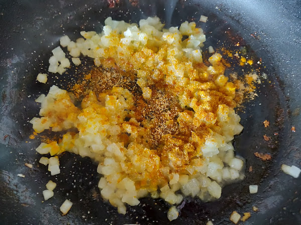 Cuando ésta empiece a tomar color añadimos las especias, curry, comino, jengibre y pimienta recién molida.