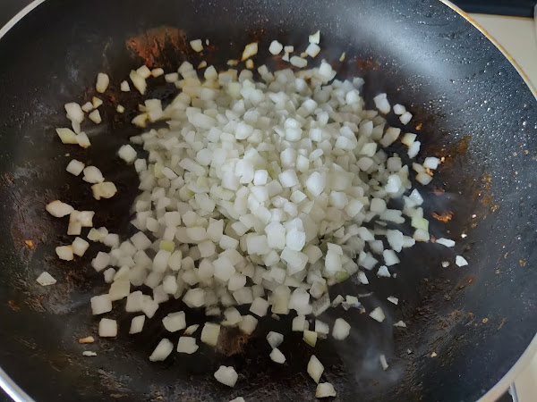 En la misma sartén pochamos la cebolla picada con el ajo en polvo.