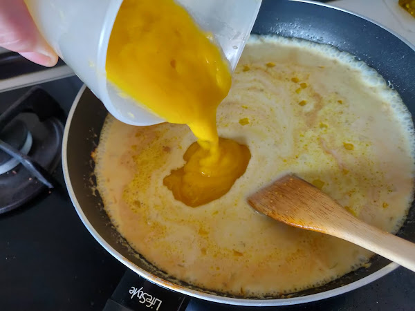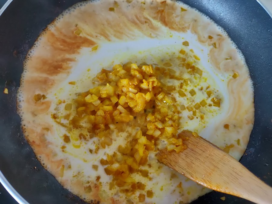Agregamos la leche de coco a la sartén y dejamos a fuego medio hasta que empiece a hervir.