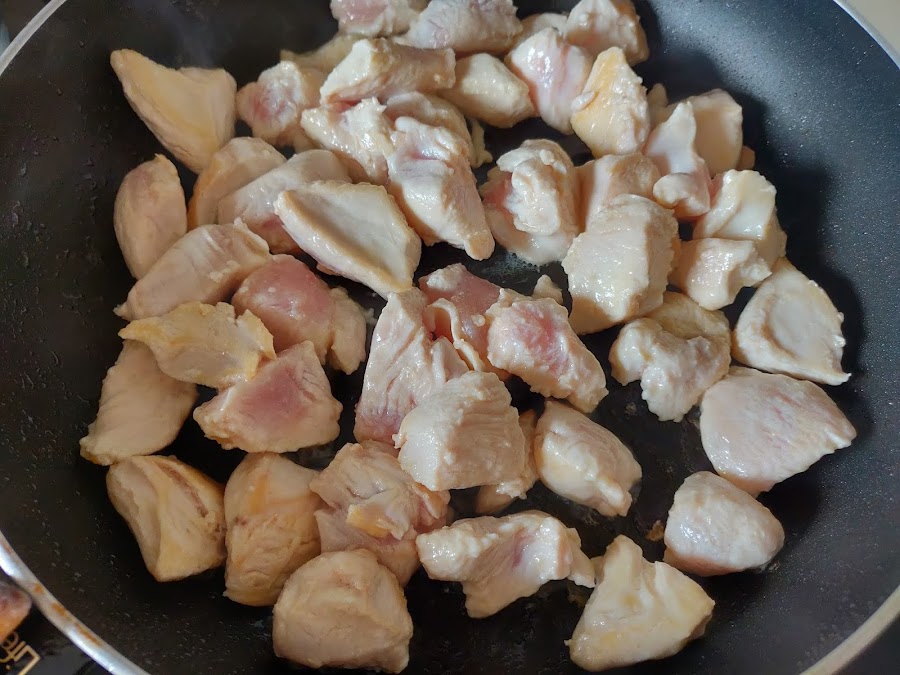 Seguidamente cortamos el pollo a dados y lo salteamos ligeramente en una sartén con un poco de aceite y reservamos.