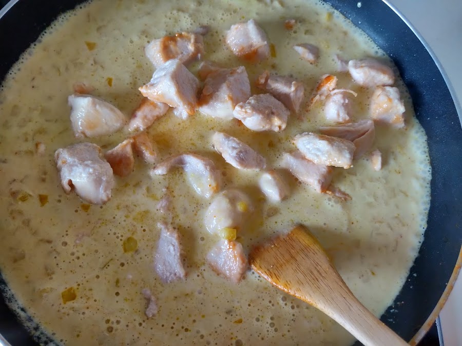 Incorporamos el pollo y dejamos 5 minutos a fuego bajo para que coja sabor.