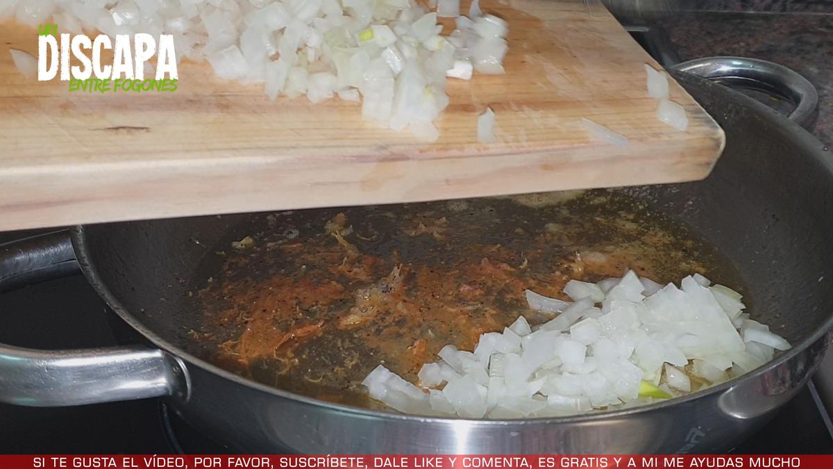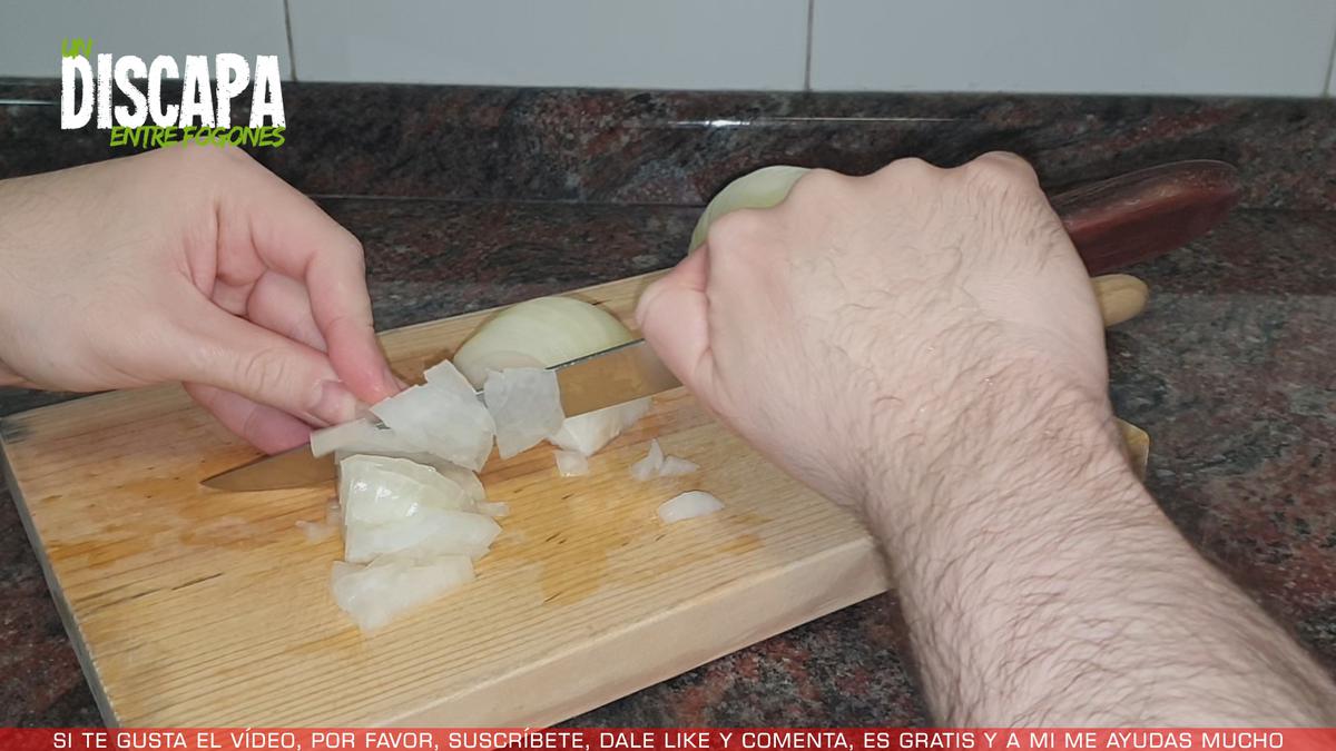 2Mientras se va dorando el pollo, cortamos una cebolla en trocitos pequeños.