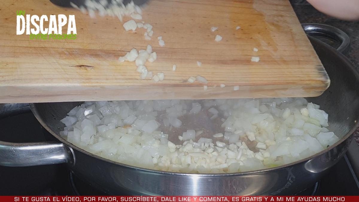 4Mientras se pocha la cebolla picamos finamente un par de dientes de ajo y los añadimos a la cazuela. Añadimos pizca de sal y dejamos que se rehogue todo conjuntamente.