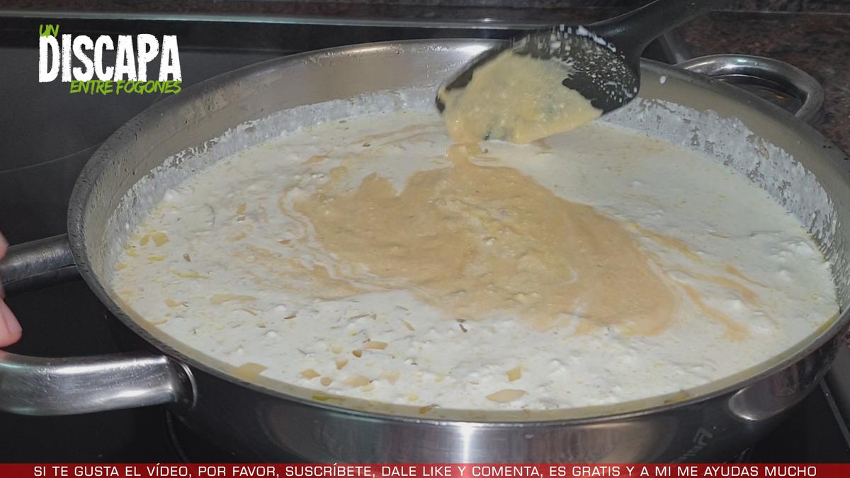 5Pasados unos minutos añadimos el zumo de medio limón, la nata (crema de leche) líquida, la mostaza, el azúcar y añadimos sal al gusto. Mezclamos todo bien hasta que se integren los ingredientes.
