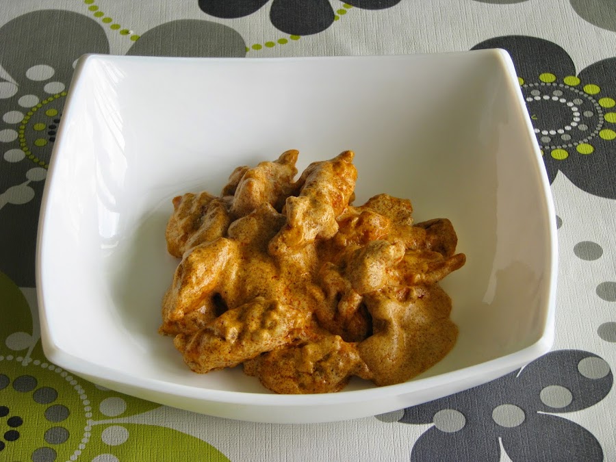 - Echa las tiras de pollo ya fritas en una cazuela, añade la nata (crema de leche) y déjalo cociendo a fuego lento durante 10minutos aproximadamente hasta que la salsa espese un poco y coja un color anaranjado como en la imagen.