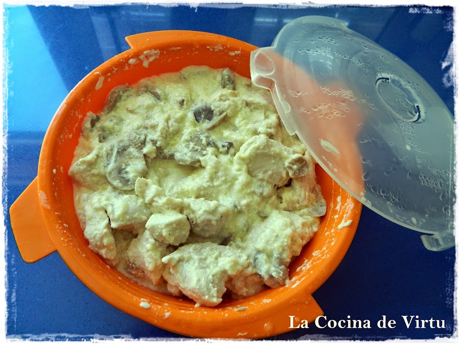 En un recipiente apto micro (en mi caso en la olla de microcheff) ponemos el pollo y los champiñones escurridos, vertemos la mezcla de queso y nata (crema de leche), movemos bien para que quede repartida.