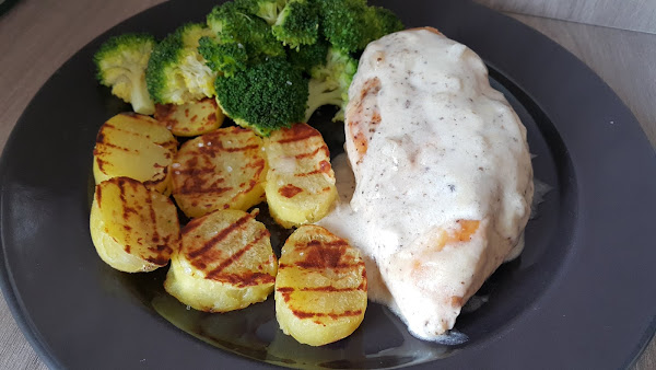 Montamos el plato poniendo las patatas, el brócoli y el pollo con un poco de salsa por encima.