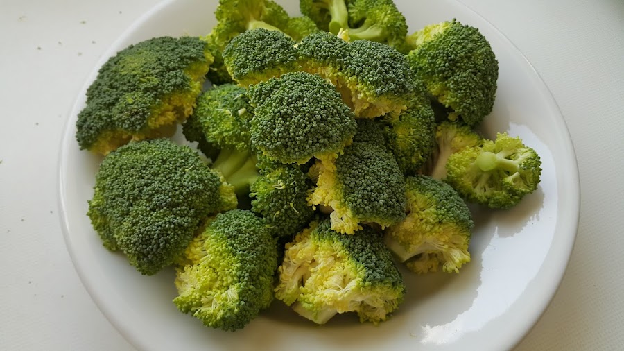 Cortamos el brócoli en arbolitos y lo cocinamos al vapor en el microondas 5 minutos a 700W con la tapa puesta.