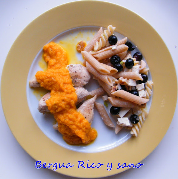 En casa la carne que más comemos es pollo, así que siempre estoy buscando nuevos sabores con los que casarlo y nuevas formas de prepararlo. La de hoy es una receta sencillísima, pues el pollo está hecho a la plancha sin más, pero queda jugosito y bien sabroso gracias a una sencilla salsa de zanahoria y coñac que me he sacado de la manga ;) De guarnición he preparado esta rica ensalada de pasta, nueces, feta y arándanos que le va de lujo ;) Para 4: