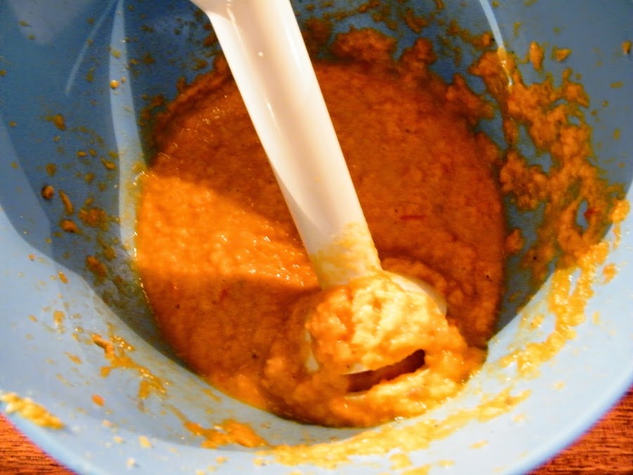 6. Finalmente lo sacaremos todo a un cuenco hondo, retiraremos las hojas de laurel y trituraremos. Iremos poco a poco añadiendo el caldo restante hasta que adquiera la textura que más nos agrade. Es una salsa espesa, cremosa; yo uso el 1/2 litro de caldo entero. Y ya sólo nos queda servir el pollo y la salsa por encima.