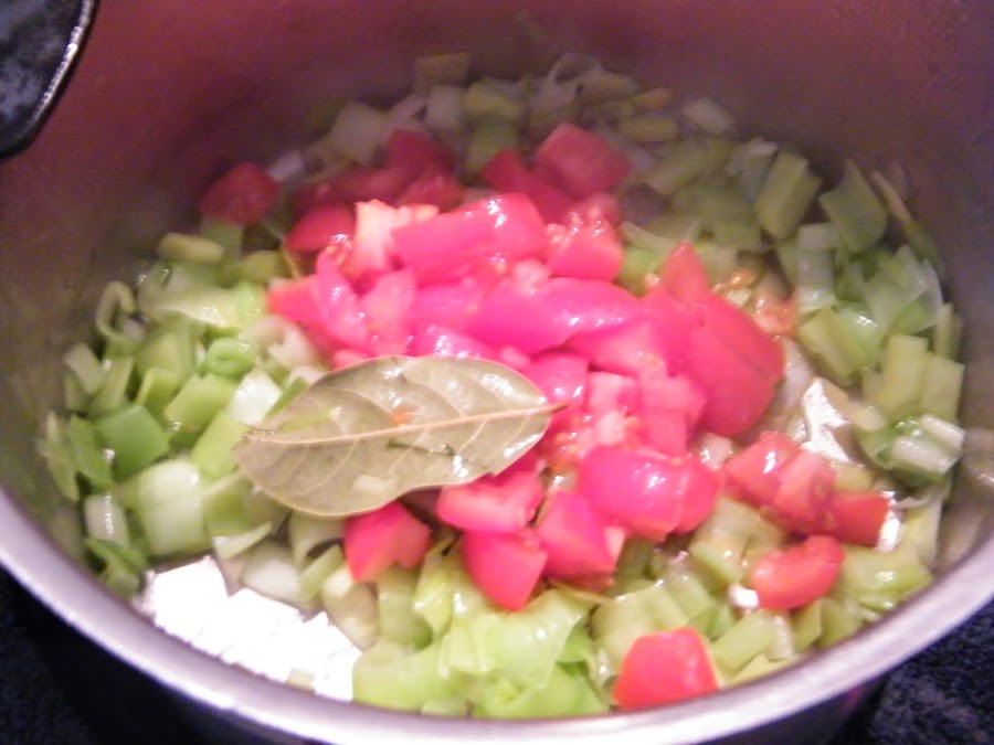 3. Cuando veamos que el puerro está medio hecho, incorporamos el tomate y las hojas de laurel y le damos un par de vueltas.