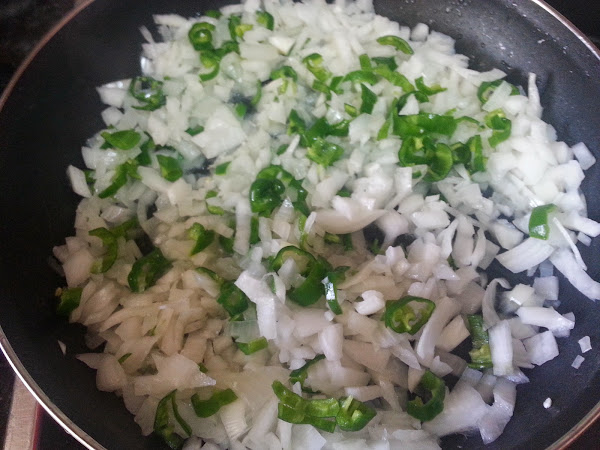 Picamos bien la cebolla, calentamos el aceite en la misma sartén y freímos la cebolla un par de minutos. Troceamos los pimientos muy fino y agregamos.