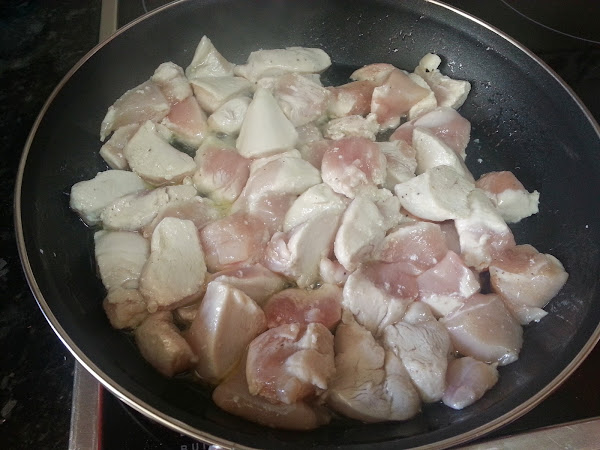 Troceamos las pechugas, salpimentamos y las doramos en una sartén antiadherente unos minutos. Retiramos y reservamos en un recipiente.