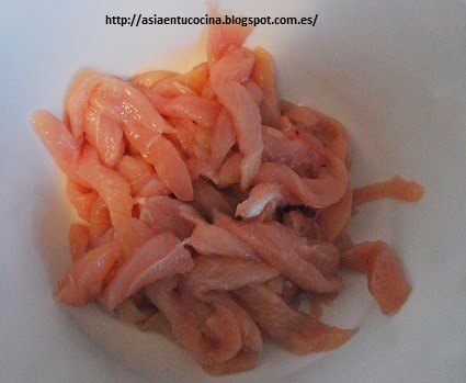 1 pechuga de pollo entera (aprox 500 gr) fileteada y cortada en tiras de aproximadamente 1,5 cm de ancho.