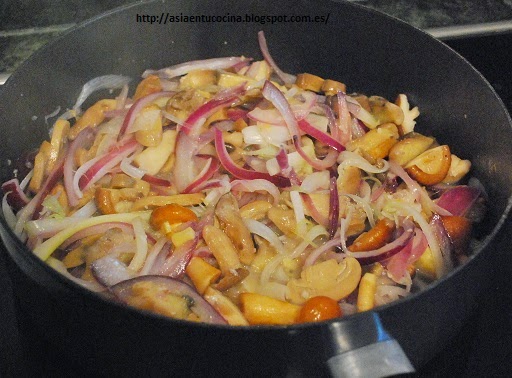 La receta original utiliza cantidades iguales de setas shiitake, maitake y champiñones. Yo he utilizado champiñones y una bolsa de setas congeladas surtidas que incluyen shiitake, hongos y un poco de todo.