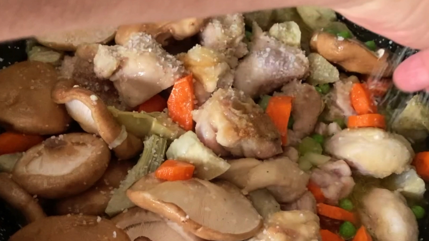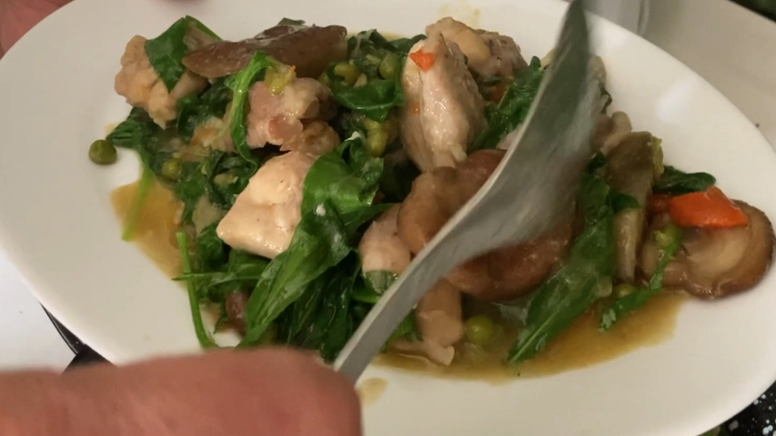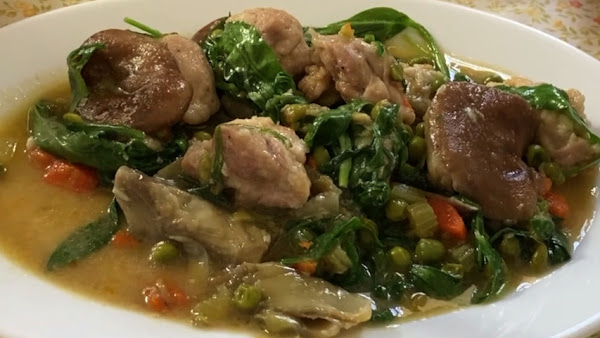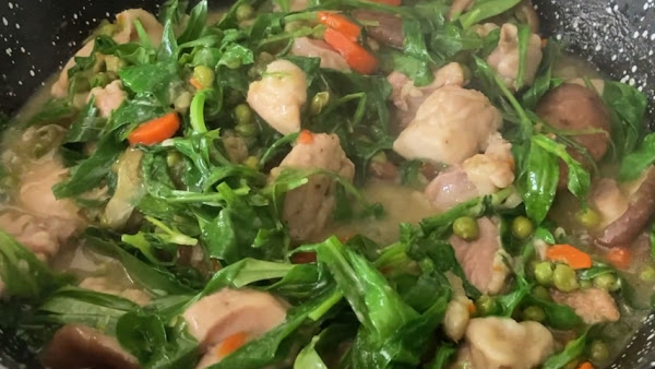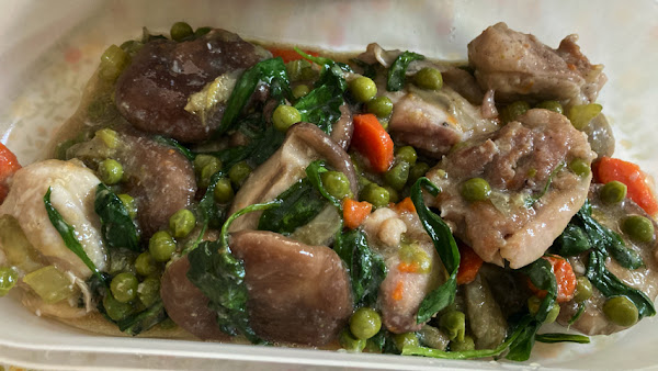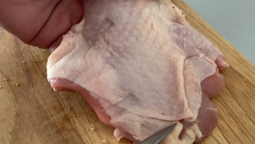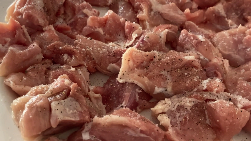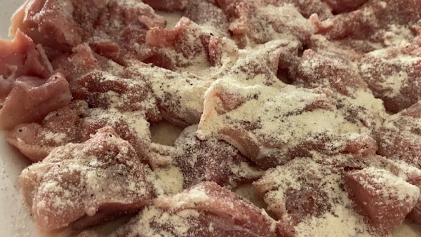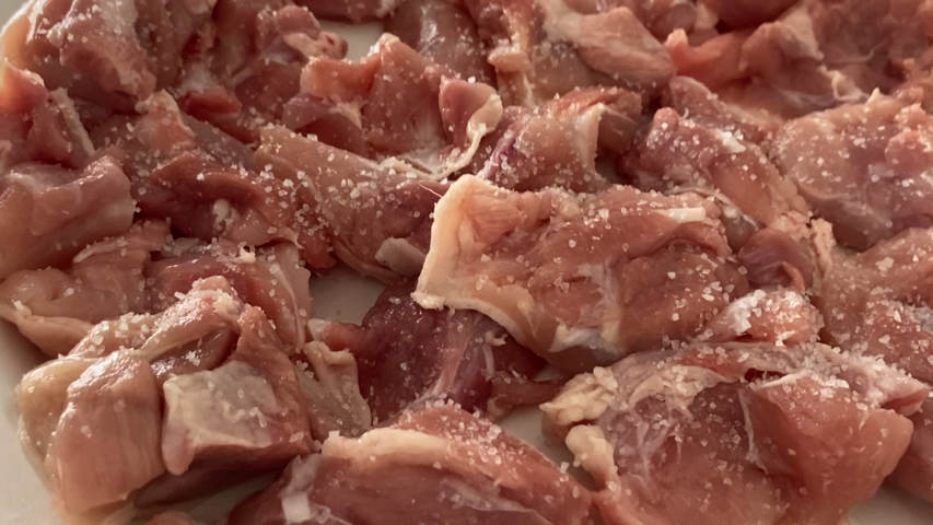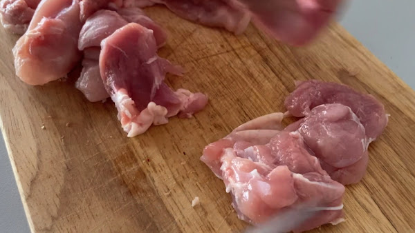 Limpia y trocea los contramuslos de pollo en trozos de bocado. Yo les dejo la piel pero puedes quitarla.