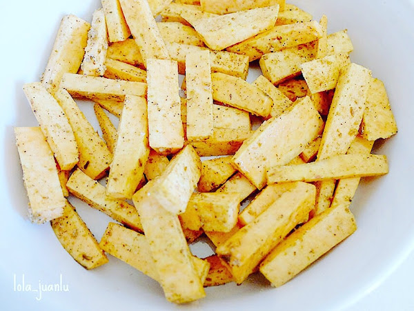 A continuación, lavamos y secamos bien el boniato. Lo pelamos y lo cortamos a gajos. Introducimos en un bol los gajos de batata y añadimos el aceite, las especias, la sal y la pimienta. Removemos y vertemos el contenido en una fuente de horno. Llevamos al horno y horneamos durante 15 minutos a una altura media alta. Transcurrido este tiempo, removemos y volvemos a hornear durante otros 15 minutos. Una vez hayan pasado los últimos 15 minutos, cambiamos a la función grill y doramos los gajos de boniato durante 5 minutos más.