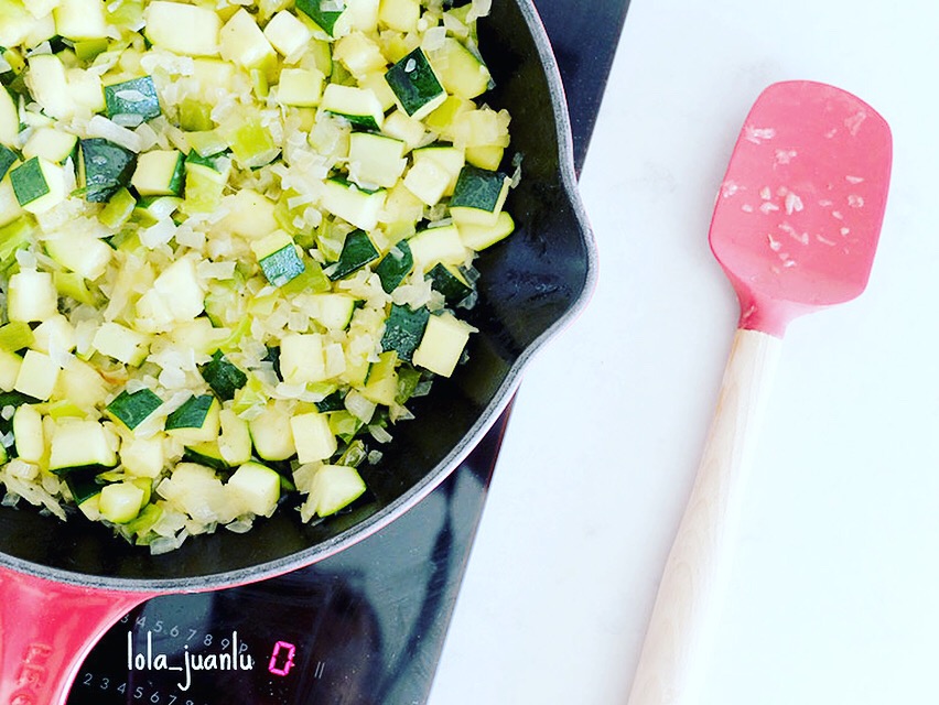 Cortamos el calabacín también en mirepoix pero más grande y lo agregamos al sofrito. Salpimentamos y sofreímos a fuego medio-bajo hasta que el calabacín tenga la textura que deseemos. A mi me gusta que el calabacín esté al dente, que no esté demasiado tierno. Removemos de vez en cuando para evitar que se pegue.