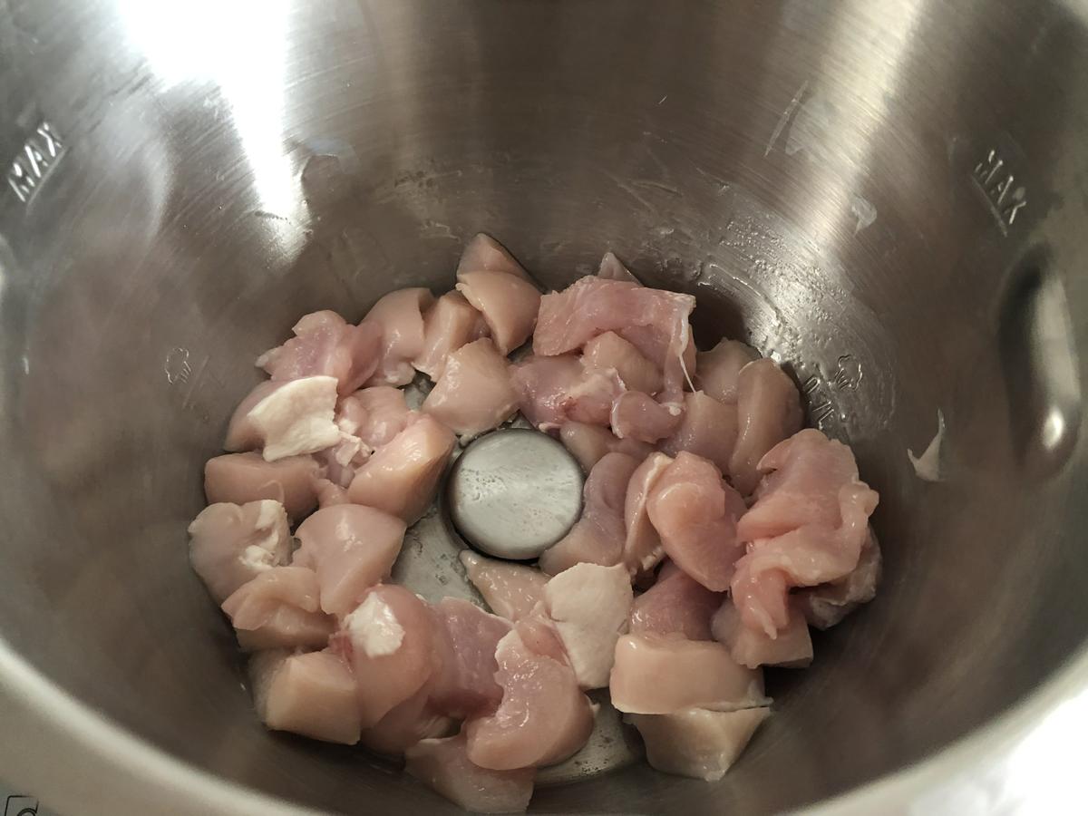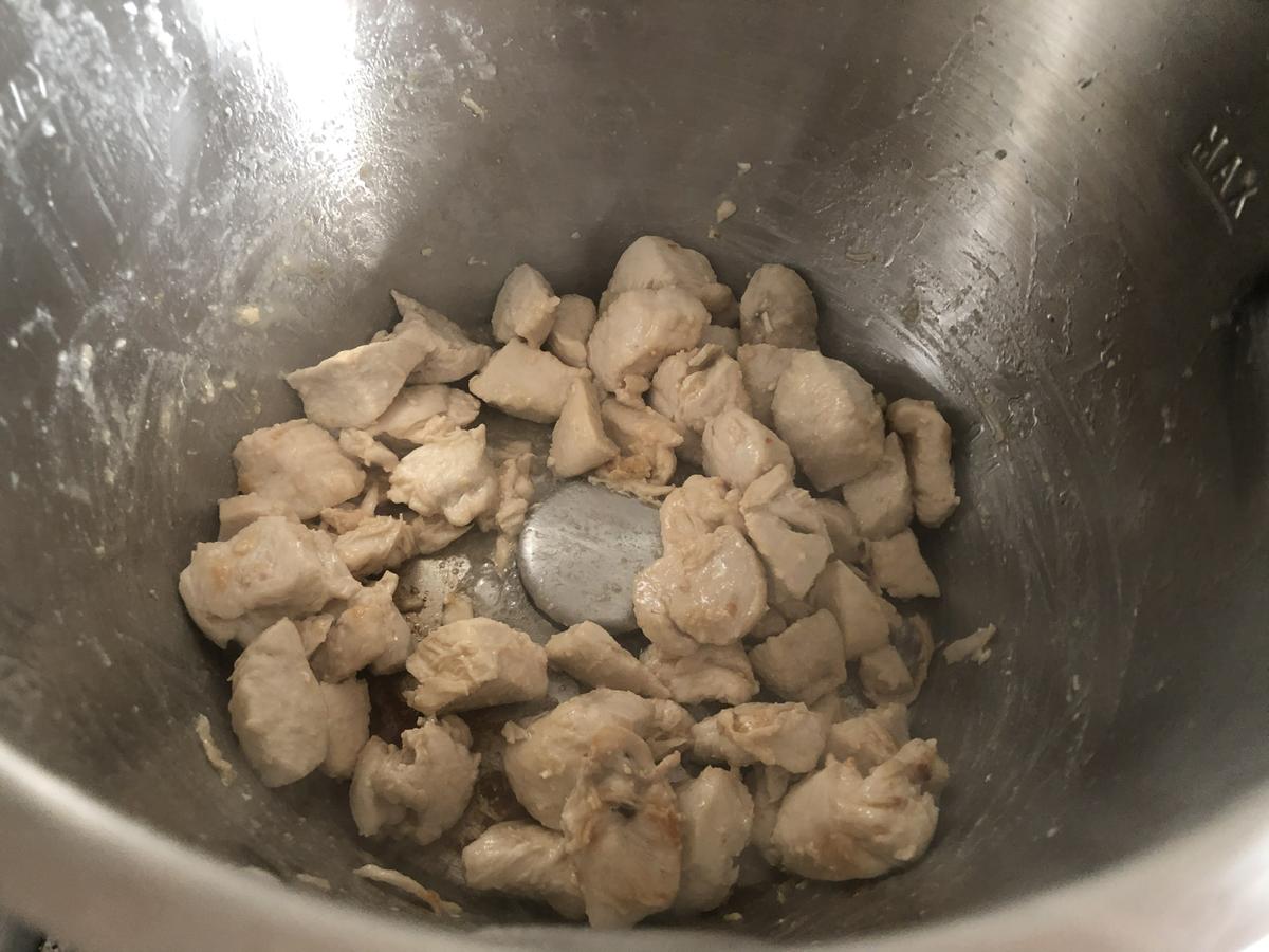 2.Añadimos el pollo cortado en dados y programamos 140º, 5 minutos. Mientras avanza el tiempo vamos removiendo con la espátula de vez en cuando. Programamos de nuevo 5 minutos, esta vez a 150º. Si es preciso, pues damos más tiempo hasta que dore el pollo. Una vez hecho, lo pasamos a un plato y lo condimentamos con sal y especial al gusto; yo he puesto hierbas provenzales.