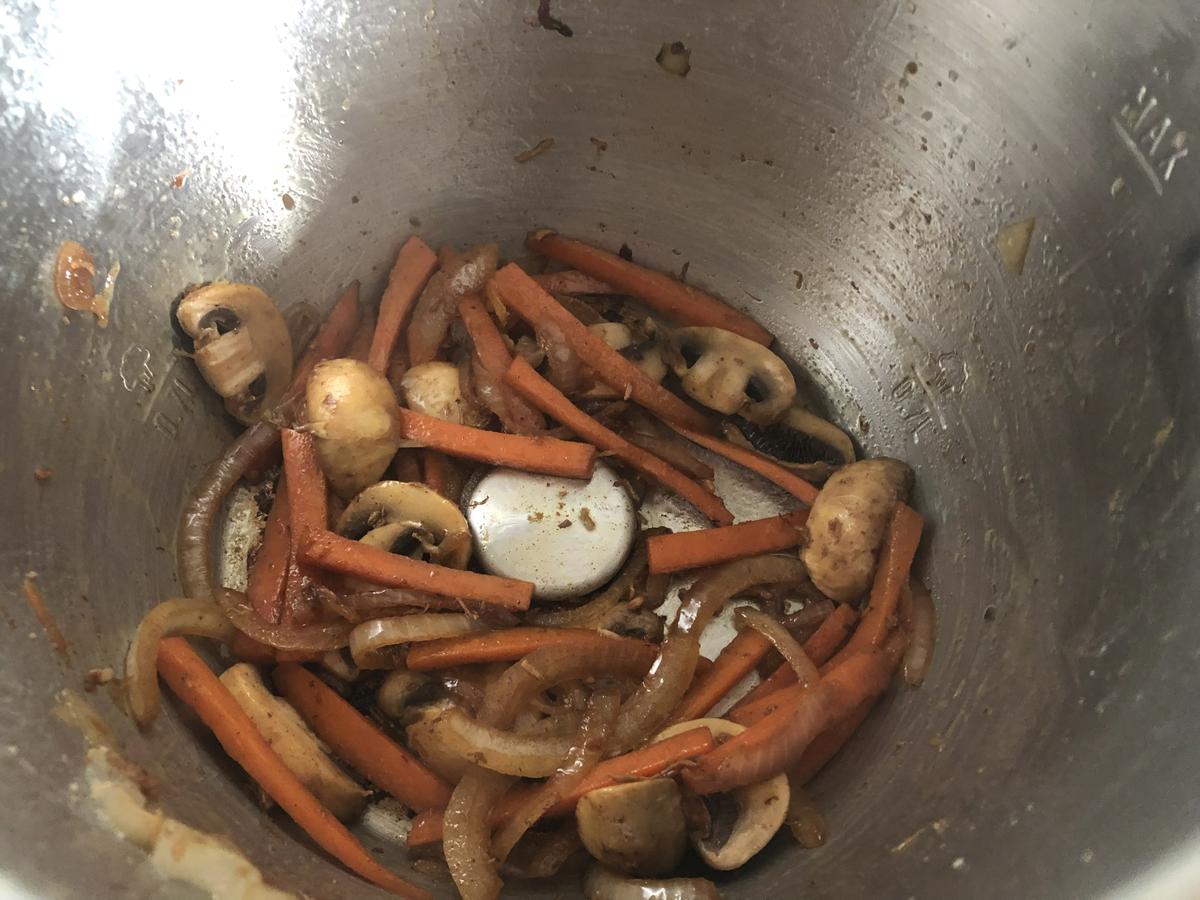 6. Añadimos un chorro de vino y programamos 150º, 2 minutos para que se evapore el alcohol.
