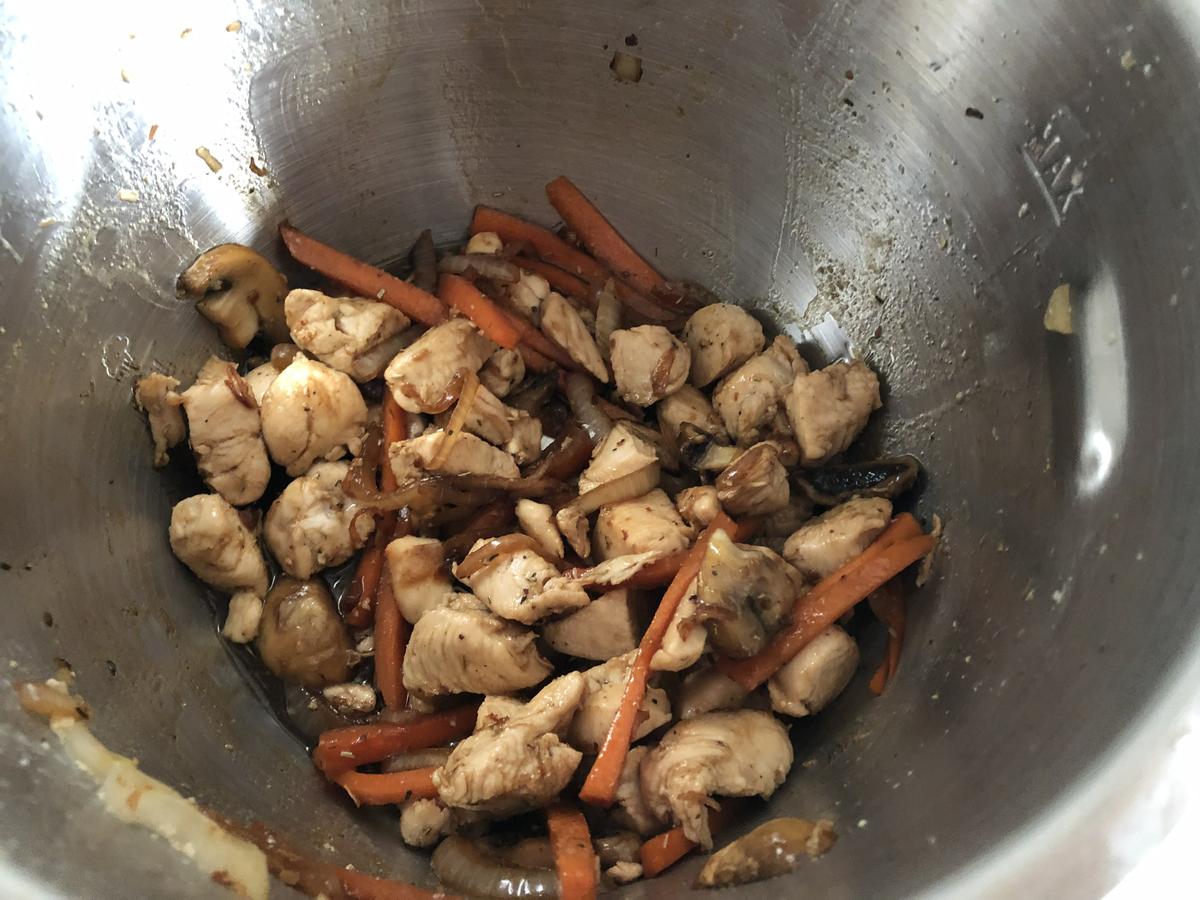 7. Incorporamos la miel, la salsa de soja y el pollo reservado. En un vaso, diluimos la maicena con el agua removiendo bien para que no queden grumos y lo añadimos también al bol. Damos una vuelta con la espátula y programamos 135º, 10 minutos removiendo de vez en cuando. Ha de quedar espesito, de no ser así, dejamos algún minuto más.
