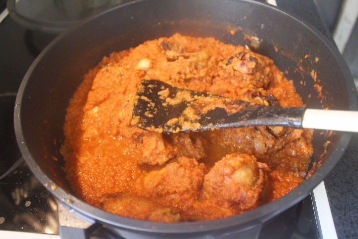 Cuando la cebolla esté tierna, añadimos los tomates triturados, el vino, el pollo, bajamos el fuego al mínimo y dejamos cocer tapado, alrededor de 60 minutos.