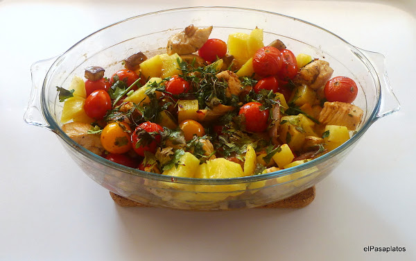 Pasamos el contenido de la sartén, las patatas y el pollo a una fuente de horno. mezclamos suavemente y añadimos los tomates reservados, el perejil y el estragón.