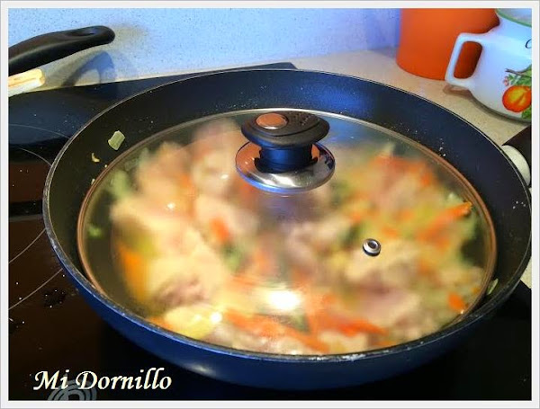 Rehogamos la verdura, si es la del Mercadona, le añadimos mas cebolla, y esta la ponemos primero.Añadimos el pollo troceado y dejamos que se haga poco a poco tapado.