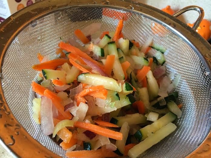 Se puede sustituir la verdura por una bolsa de salteado fresco del Mercadona, que ya viene cortada.Yo la utilizo algunas veces.
