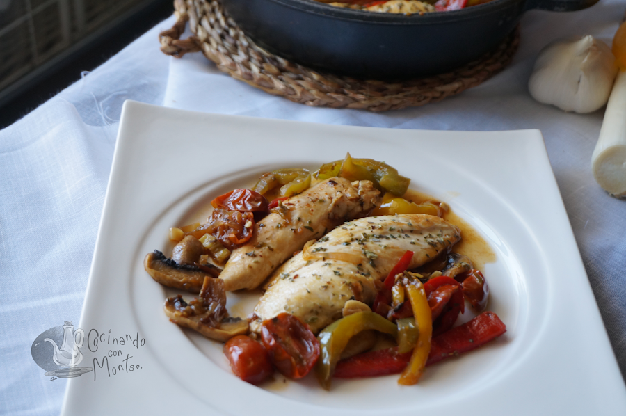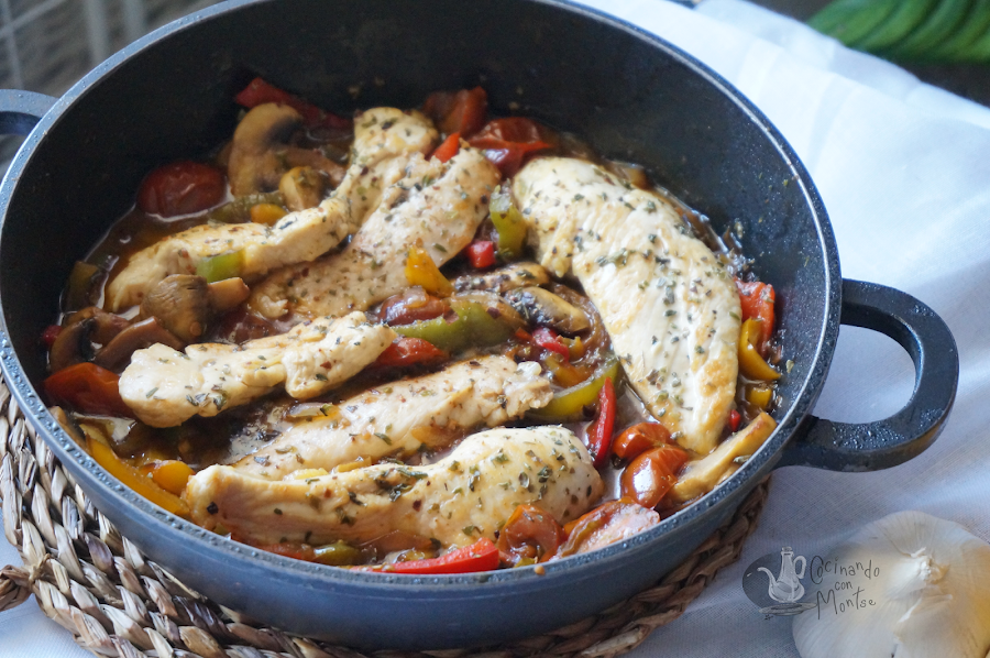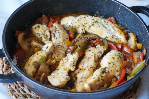Seguido añadimos un poco de caldo, movemos si vemos que hay suficiente salsa lo dejamos, si queréis más añadir más caldo. Incorporamos las pechugas de pollo y dejamos todo 5 minutos se mezclen los sabores. Espolvoreamos con un poco de orégano o la especia que os guste.