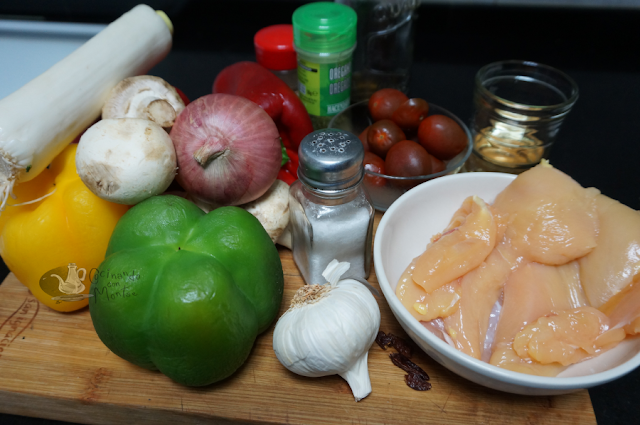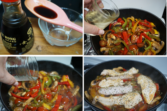 NOTA: Este plato se puede hacer con ternera, pavo, cerdo... Se puede poner otras especias como jengibre. Las verduras se pueden utilizar las que os guste, incluso aprovechar las que os van quedando por la nevera, yo puse los tomates Cherry para aprovecharlos. Para que parezca más oriental, en vez de vino poner vinagre de arroz.