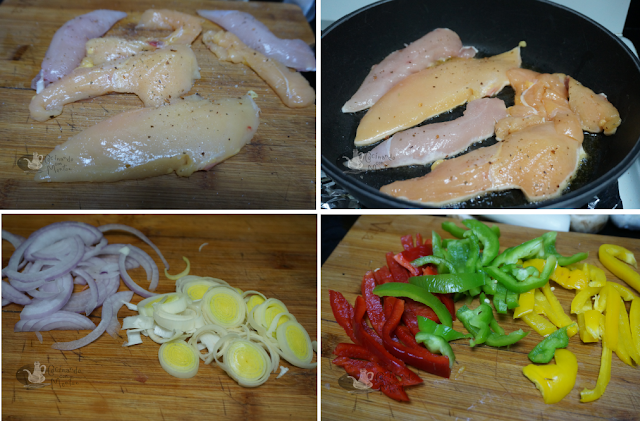 Por otro lado preparamos las verduras. Lavamos las verduras, cortamos el puerro, la cebolla, cortamos los pimientos en tiras.