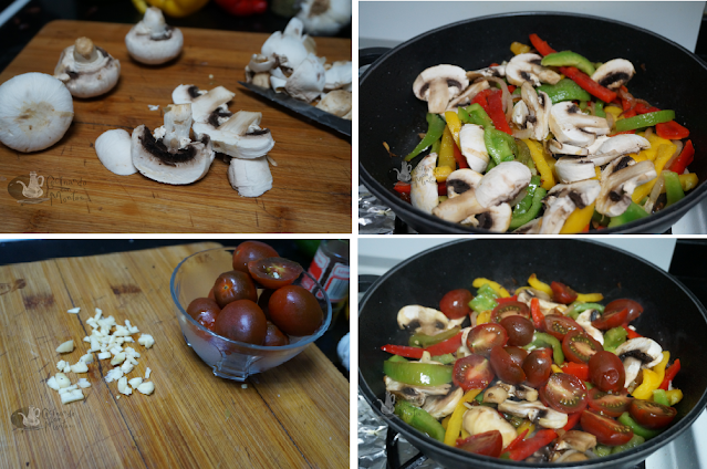 Y en mi caso las verduras que más lleva son pimientos, me encantan, he utilizado pimientos de tres colores, que están muy buenos salteados. También lleva cebolla pochada, en este caso a quién no le guste la puede quitar y los champiñones, siempre que tengo los pongo en cualquier receta.