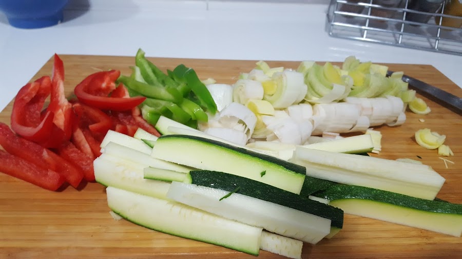 3.- Ahora cogemos el calabacín y lo cortamos por la mitad con un corte vertical y lo lavamos. Después lo hacemos a bastoncillos, quitando la semilla del medio. Reservamos.