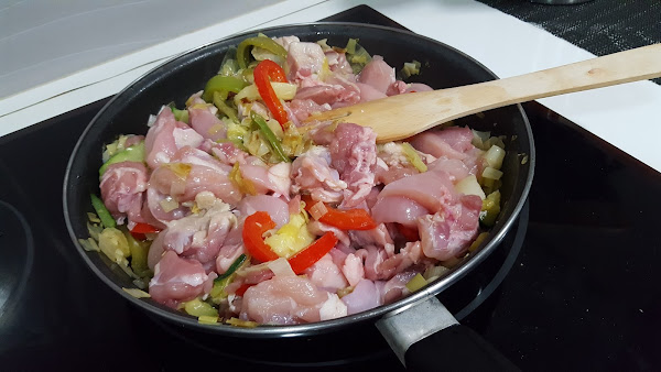 6.- Pasados unos 10 minutos las verduras estarán empezando a pocharse. En ese momento, echaremos los trozos de pollo y seguiremos cocinando a fuego medio durante 15 minutos.
