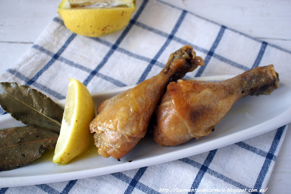 1) Poner en una sartén honda o cazuela los muslitos de pollo, añadir el resto de ingredientes. Llevar a fuego lento unas 3 horas, dándoles la vuelta con cuidado de vez en cuando.