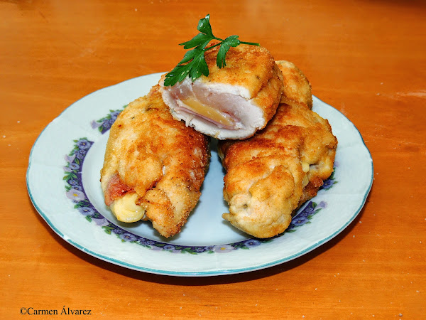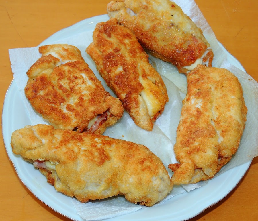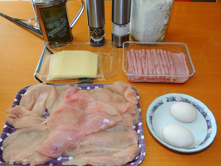 5 filetes de pechuga de pollo cortados finos, 5 lonchas de jamón york, 5 lonchas de queso (u otro tipo de queso cortado en cuñas), sal, pimienta, uno o dos huevos batidos, pan rallado, harina y aceite de oliva.
